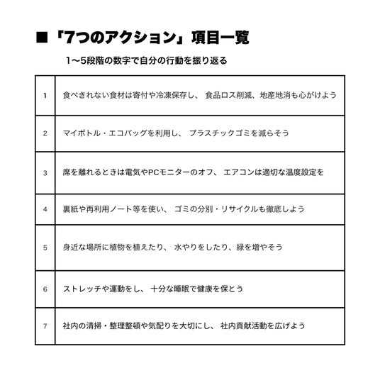 節電や食品ロス削減、プラスチックごみ削減など、日常業務の中で実践できる行動を社員全体で意識する取り組みです。