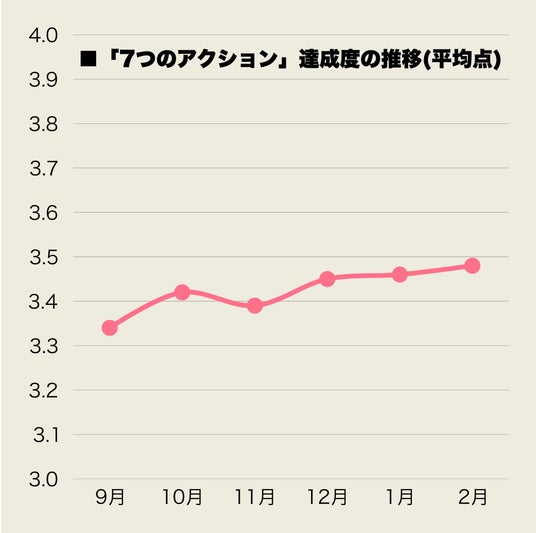 アンケート開始当初の平均スコア3.34に対し、直近では3.48へと上昇しており、社員のSDGsへの意識にも少しずつ変化が見られています。