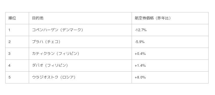 海外行き往復航空券の平均価格が全体で上昇するなか、安くなっているのは1位のデンマーク・コペンハーゲン、2位のチェコ・プラハ行き航空券です。例年より長い連休を利用して、比較的フライト時間の長いヨーロッパへ旅行するなら、この2都市は狙い目と言えるでしょう。