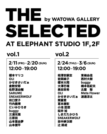 2022 年 2月11日(金・祝)~20日(日)と2月24日(木)~3月6日(日)の期間中、アートプロジェクトプロデュース集団「WATOWA GALLERY(ワトワギャラリー)」が注目する若手アーティストをセレクトし紹介する企画展「THE SELECTED vol.1 / vol.2」を、東京・渋谷のオルタナティブスペース「elephant STUDIO」にてそれぞれ開催いたします。
