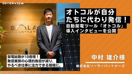 「架電業務を効率化できた」、「他の仕事に当てられる時間を増やせた」、「担当者様のストレスを軽減できた」このような価値を感じて頂いていることに非常に嬉しく感じております。社員の方でオトコルを知らない人はいないという言葉も頂き、担当として身が引き締まる思いです。ソーラーパートナーズ様の事業の拡大に少しでもお役に立てるように、今後も全力でご支援させて頂きます!