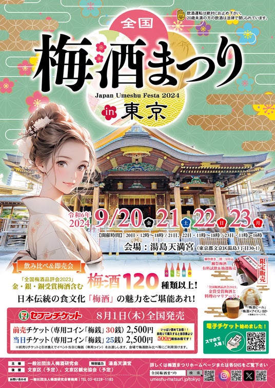 今年の『全国梅酒まつりin東京2024』では「全国梅酒品評会2023」で金・銀・銅を受賞した梅酒を含む120種類以上が勢揃い。お好みの銘柄を飲み比べ&その場でお土産にご購入いただけます。さらに、希少な「獺祭梅酒」の有料試飲&抽選販売を行います。また梅酒ビールなどの新感覚ドリンク販売、梅酒に合うお料理のマリアージュなどお楽しみいただけます。
