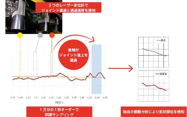 東日本高速道路株式会社、中日本高速道路株式会社、西日本高速道路株式会社および株式会社高速道路総合技術研究所と共同開発した路面の段差計測システム(特許番号:特許第6666207号)。乗用車に搭載した振動センサーとレーザー変位計、GPSを使って道路の段差やジョイントの点検に必要な情報を収集分析する。