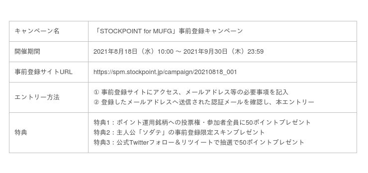 これに伴い、「STOCKPOINT for MUFG」アプリで使えるポイントや、限定アイテムなどが抽選で当たる事前登録キャンペーンを同時開催することをお知らせいたします。