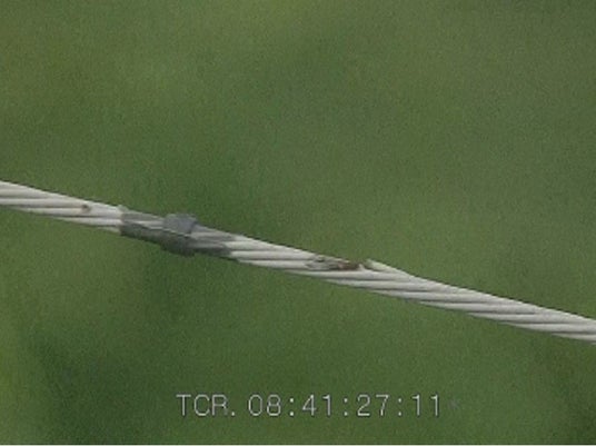 送電線への落雷を防止するために、「架空地線」と呼ばれる、避雷用の電線が設置されています。同社では、落雷による架空地線の素線切れやアーク痕などの設備損傷箇所を把握するために、定期的に架空地線点検を実施しています。