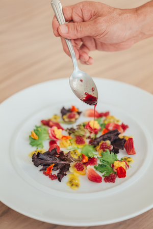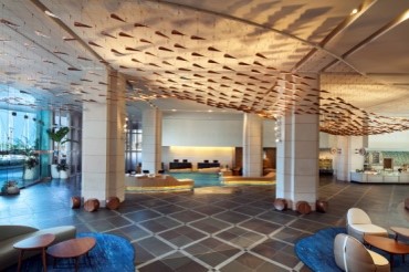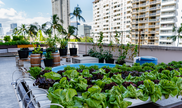 ・屋上庭園で、アクアポニックスと呼ばれる水耕栽培と魚の飼育装置を兼ねそろえた新しい農業技術を活用し、養殖と農作物を環境に優しく育てています。ここで育てた食材は、レストランで提供されます。