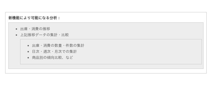 新機能を使用し在庫の出庫数量やその後の残量を確認・集計することで、消費トレンド分析や滞留在庫の特定、倉庫の活動量などを評価できます。それらを通じ、在庫削減や発注量やタイミングの最適化、倉庫の人員や配車の最適化に向けた検討を進めることが可能になります。