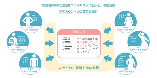 企業のSNSマーケティングを支援する株式会社コムニコ(本社:東京都港区、代表取締役:長谷川 直紀、以下当社)は、SNS上での話題づくりやファンづくりを目的とした「コラボ先仲介サービス」を開始いたします。アカウントの登録やマッチング費用は無料で、月3件までリクエストが可能です。