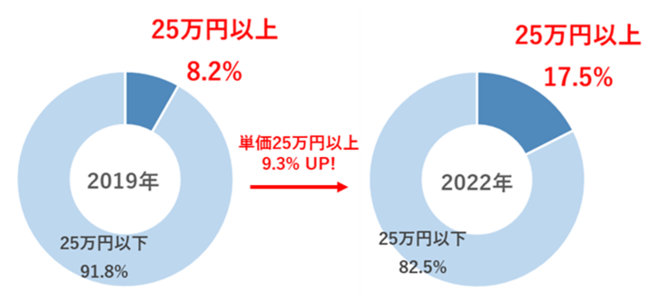 ・「五大陸」では10万円以上のスーツ購入率が11.9%増加。「Onward Personal Order」では25万円以上のスーツ購入率が10%増加と、高価格帯のスーツ購入率が特に増加している。在宅勤務の広がりなどでスーツを着用する人は減少しているが、スーツを着用する人は単価の高いスーツを好む傾向があることが伺えた。また、コロナ禍で毎日スーツを着る機会がなくなり、会食や商談などの大切な日用に良いスーツが少数あれば良いという考えの人が増加したことも要因の一つであると考察できる。