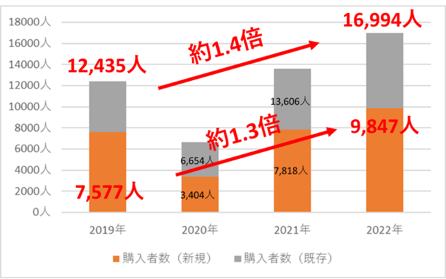 ・若年層に顧客が多い、オーダースーツエントリーブランド「KASHIYAMA」においては、購入者数がコロナ前と比較して約1.4倍に増加。新規購入者数においても約1.3倍に増加しており、全体として、購入者数が増加傾向にある。