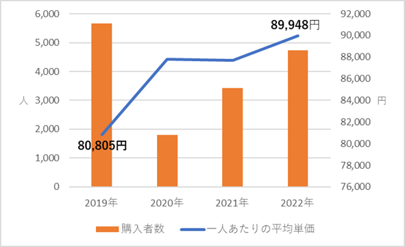 ・百貨店での展開を中心とする中年層向けブランド「五大陸」「ONWARD Personal Order」について購入者数は、コロナ前までの回復には至っていないものの、1人あたりの平均購入単価はそれぞれ1万円弱上がっていることが判明した。