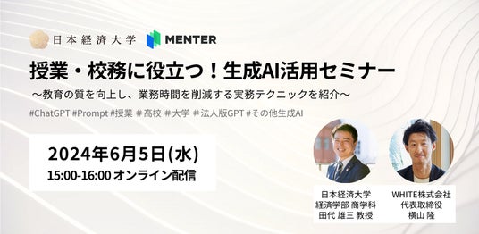 マンガ形式のDX人材育成サービス「MENTER」を提供するWHITE株式会社(本社: 神奈川県横浜市、代表取締役: 横山 隆)は、2024/06/05 (水)15:00 - 16:00にオンラインにて無料ウェビナー「授業・校務に役立つ!生成AI活用セミナー」を開催することをお知らせいたします。