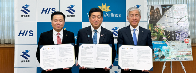 ベトナム航空(日本支社 所在地:東京都千代田区、総支配人 ゴー・シー・アイン)は、11月21日(火)に鹿児島県・株式会社エイチ・アイ・エス(本社:東京都港区 代表取締役社長:矢田素史 以下、HIS)と相互の連携を強化し、鹿児島県及びベトナムにおけるインバウンド観光の推進を図り、観光消費拡大を促進することを目的とした連携協定を締結しました。