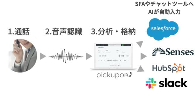 「pickupon」は、AIが電話で話した内容のサマリーをテキスト×音声で作成し、自動入力・共有してくれるサービスです。入力を意識せず、顧客との会話内容をチームのワークスペース(CRM・SFAなど)へシェアします。これにより、営業の架電シーンにおける入力漏れを防ぎ、入力コストを削減し、営業活動のブラックボックス化問題を解決します。当サービスは2019年9月の提供開始以来、スタートアップ企業を中心にユーザー数が増加し続けています。