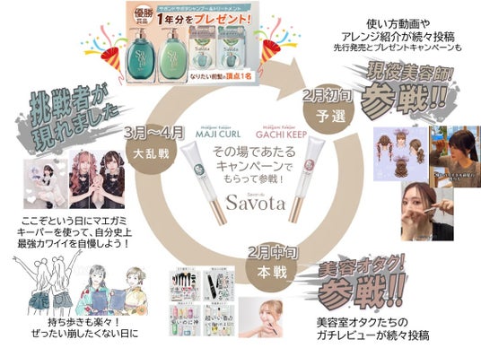 amond.代表・飯野ゆかり氏をはじめとする全国各地の実力派美容師たちが、前髪スタイリングのHow To動画やアレンジ動画を続々配信。さらに、「予選参加キャンペーン」と題して、サボンドサボタ マエガミキーパー(いずれか)がもらえるSNSプレゼントキャンペーンを実施します。