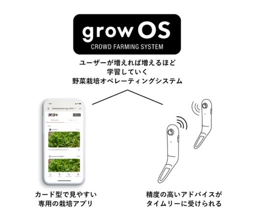 そこで、野菜栽培をしているその場所で、最適なガイドをタイムリーに行うシステムを開発、専用のIoTセンサー「grow CONNECT」が、特許技術である「Crowd Farming System」というクラウド上にデータを集約し、学習するAI・機械学習システムと連携、スマートフォンアプリ「grow GO」からユーザーやコミュニティに対して野菜からの“声”をお届け(ガイド)します。