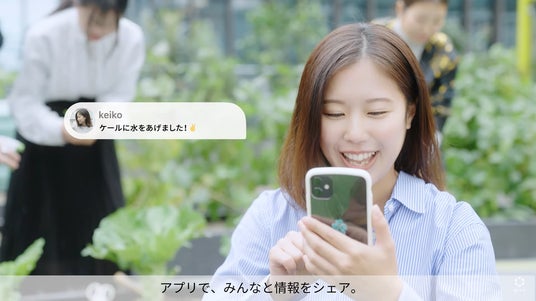今回の取り組みでは、お台場のフジテレビ本社屋にgrowのテクノロジーが搭載されたスマートコミュニティファーム 『アクションお台場ファーム』を設置し、登録した利用者みんなで野菜を育てる。種まきからお手入れ、収穫まで楽しくシェアでき、参加するだけで食や環境の課題に貢献できる仕組みになっています。