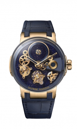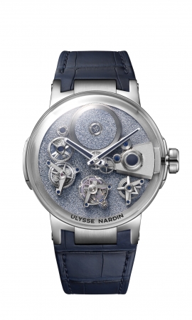 ディープブルーのアベンチュリンの文字盤は、星が瞬く煌めく夜空を思わせます。半透明クォーツの一種である「アベンチュリン」の名前は、イタリア語で「幸運」を意味する「a ventura」に由来します。「a ventura」には単に「冒険を始めよう」という意味もあります。ユリス・ナルダンの「ブルーアベンチュリン チンギス・カン 789-80」にも使用した鉱物のアベンチュレッセンスは、暗闇の中で海面を凝視している船乗りたちが見かける光の揺らめきのように、キラキラと輝いて見えます。