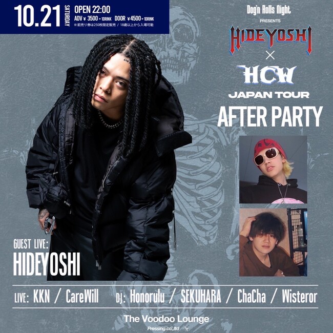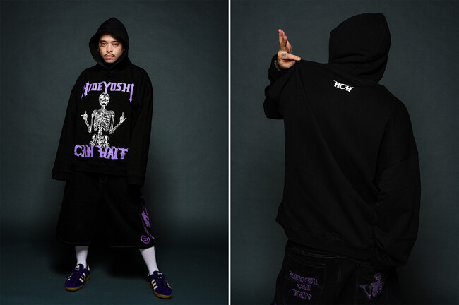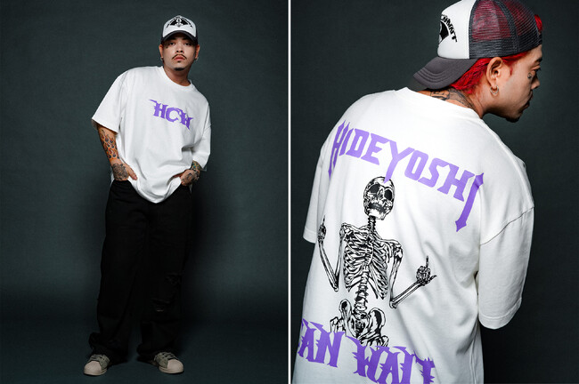 今回のコラボレーションアイテムは、Hideyoshiのネームロゴが大胆にプリントされたデザインや、トレンドのゲームシャツにHeaven Can Waitのシグネチャーデザインのスカルと、Hideyoshiの家紋を組み合わたグラフィックなど、目を惹くデザインでファンの期待に応えるコレクションとなるでしょう。