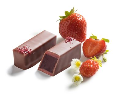 イチゴ風味の薄いチョコレートを重ね、ミルクチョコレートでコーティングしたフランス産イチゴのピュレを用いたダークガナッシュ。