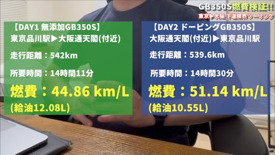 ホンダGB350Sで東京~大阪間を一般道のみで往復し、オイル添加剤「ルブロイド」の燃費性能を検証。添加前の往路は約44.86km/Lだったのに対し、ルブロイドを添加した復路では約51.14km/Lを記録し、約6.5km/Lの燃費向上を確認。