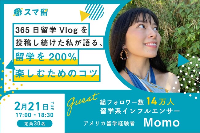 「1億総留学社会へ」をブランドフィロソフィに掲げ、留学サービス「スマ留」を展開する株式会社リアブロード(本社:東京都渋谷区 代表取締役:神田慎)は、留学先の紹介及び留学手続きの代行、海外に関する情報提供を行っています。この度、フォロワー数14万人以上の留学系インフルエンサー「Momo」さんをゲストにお招きし、スマ留イベント「365日留学Vlogを投稿し続けた私が語る、留学を200%楽しむためのコツ」を2月21日(火)に開催決定したことをお知らせします。