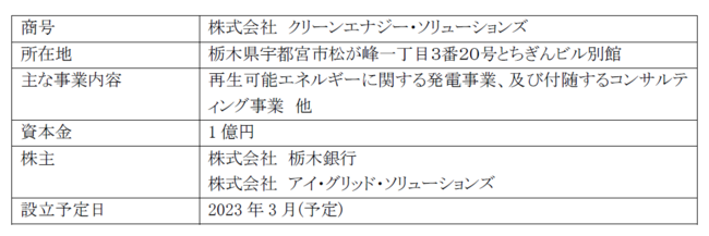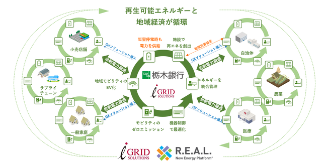 グリーンテックを推進し、グリーンエネルギーが地域をめぐるサスティナブルな世界の実現を目指す株式会社アイ・グリッド・ソリューションズ(本社:東京都千代田区、代表取締役社長:秋田 智一、以下「アイ・グリッド」)は、株式会社栃木銀行(本店:栃木県宇都宮市、取締役頭取:黒本 淳之介、以下「栃木銀行」)と、関係当局等の認可取得を前提として、地域内で再生可能エネルギーを創出/循環させることで、地域脱炭素化、レジリエンス強化、地域経済循環とを実現することを目指す、再生可能エネルギー関連事業を営む他業銀行業高度化等会社※1を共同で設立することについて合意したことをお知らせいたします。