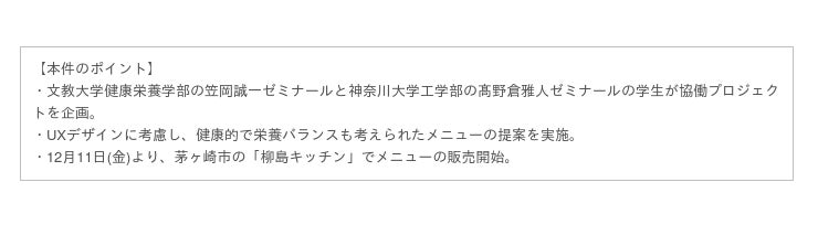 文教大学健康栄養学部の笠岡誠一ゼミナールと神奈川大学工学部の高野倉雅人ゼミナールの学生が協働プロジェクトを立ち上げ、文教大学の所在地である神奈川県茅ヶ崎市にある「柳島キッチン」へメニューを提案。開発されたメニューを、12月11日(金)より販売開始します。