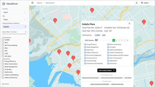 EaSyGo ValueDriverの新機能として、世界のオフィスビルの「サステナビリティ要素」と「入居企業への体験価値」を可視化