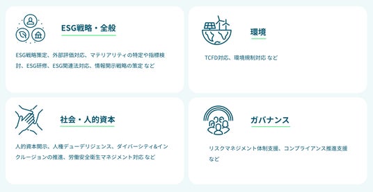 こうしたESG領域の経営課題をお持ちの企業に対し、これまでのプロフェッショナルブティック事業で培った専門知識と経験を活かし、課題解決支援をしたいという想いからESG領域へのサービス展開することといたしました。