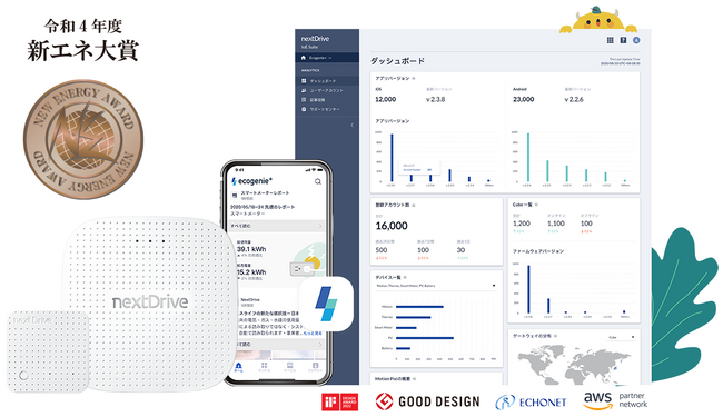 NextDriveでは、IoEプラットフォーム「Ecogenie+」をベースにエネルギーマネジメントコントローラー、モバイルアプリ、クラウドサービスを活用して家庭用蓄電システムの制御を行ないます。