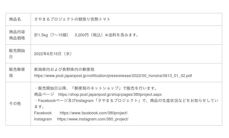 日本郵便株式会社(東京都千代田区、代表取締役社長 衣川 和秀)は、生産からお届けまでを自社で一貫して手掛けるオリジナル商品「さやまるプロジェクトの朝採り完熟トマト」を、2022年6月15日(水)から郵便局のネットショップで販売開始します。また、同日から新潟県内および長野県内の郵便局に設置するふるさと小包チラシでも申し込みを受け付けます。