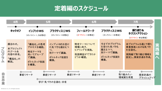 ・前半(4月~7月):課題の構造的な分析方法を体得するための構造化ワークショップ(定着フェーズ)