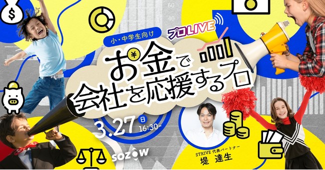 Go Visions株式会社(所在地:東京都品川区、代表取締役:小助川 将)が運営する小・中学生向けオンラインの学び場「SOZOW(ソーゾウ)」は、3月27日(日)に、ベンチャーキャピタルSTRIVEの代表パートナーである堤 達生氏をゲストにお迎えし、お金や投資について子どもたちが直接お話を聞ける特別イベントを開催いたします。