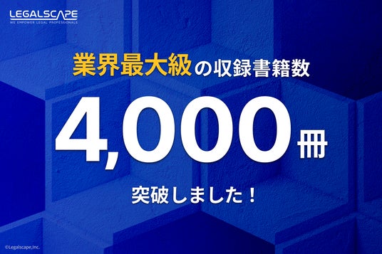 株式会社Legalscape(本社:東京都文京区 代表取締役社長・最高経営責任者:八木田 樹、以下リーガルスケープ)は、リーガルリサーチプラットフォーム「Legalscape(リーガルスケープ)」の収録書籍数が4,000冊を突破いたしましたことをお知らせします。