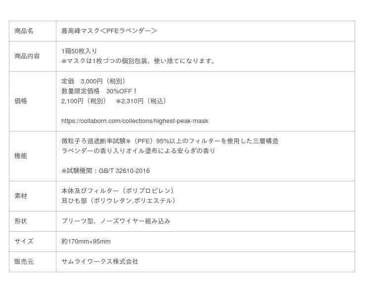 原価マスクや日本の技術の粋を集めた究極マスクを展開するサムライワークス株式会社(代表取締役社長:新島 実 本社所在地:東京都渋谷区)は、まだまだ続く猛暑で快適に感染予防を行ってもらう為に、1か月で累計300万枚販売の3層構造不織布マスクに高密度(PFE95%以上)のフィルターを採用し、更に穏やかでほんのり甘いラベンダーの香りでリラックス!