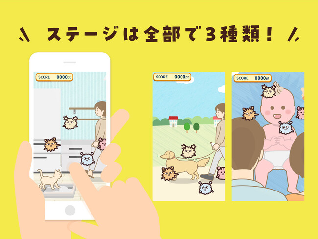 生活の中で気になるニオイが発生する3つのシチュエーションからプレイすることができます。また、ステージ・得点によってもらえる壁紙(消臭カード)が変わります!