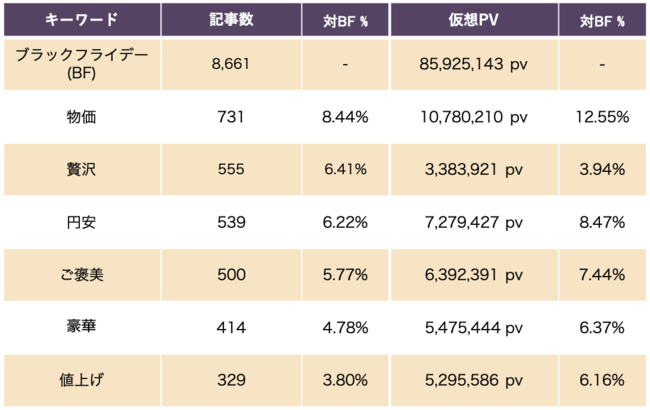 「物価」と「ブラックフライデー」を含む記事は、「ブラックフライデー」を含む記事全体の8.44%、仮想PV(後述)では12.55%を占めます。