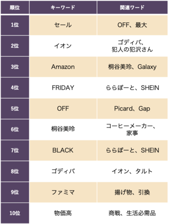 次に、「ブラックフライデー」を含む記事の中でのトレンドワードを見てみます。