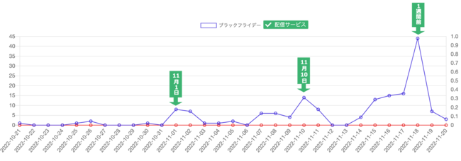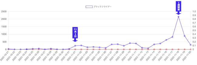 まず「ブラックフライデー」を含む記事数の推移を見ると、それまでほとんどなかった記事が11月1日に突然増えています。