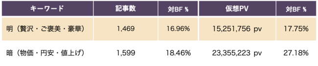 上記の表のワードを明(贅沢・ご褒美・豪華)と暗(物価・円安・値上げ)のグループに分けると、暗いワードのグループが数字で上回ります。