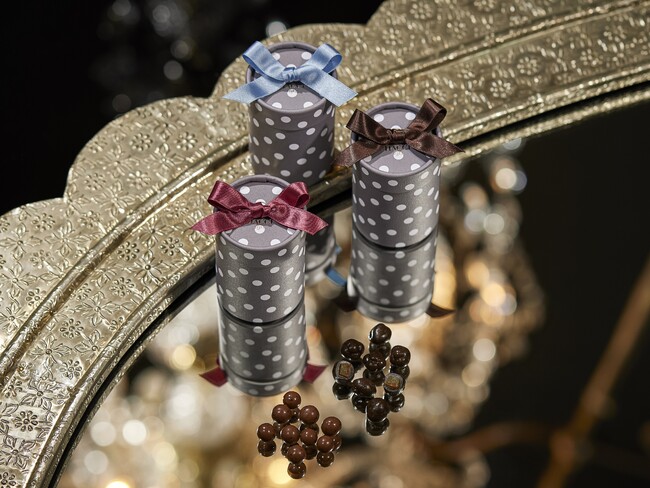 はちみつがローストしたヘーゼルナッツの高貴な香りと風味を引き立て、厳選したベルギーチョコとココアパウダーで調和。口の中に広がる濃厚なヘーゼルナッツとチョコレートのベストバランスを楽しめます。エレガントなジュエリーBOX 缶入りはプレゼントにもおすすめです。