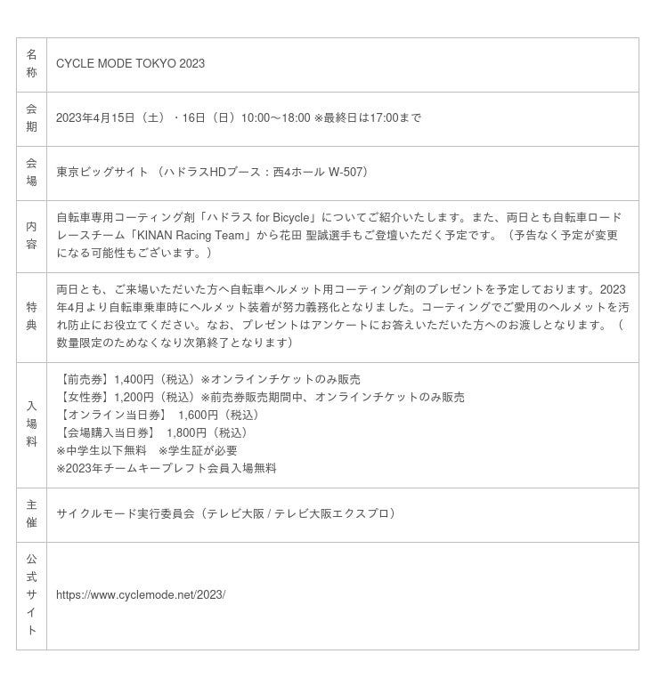 【4/15・16|西4ホール W-507】ロードレースチームKINAN Racing Team<花田 聖誠>選手も緊急参加!自転車専用コーティング剤「ハドラス for Bicycle」をご紹介