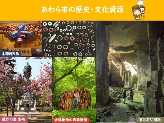 国の重要文化財に指定されている縄文時代の「玦状耳飾」の他、アニメに描かれるような幻想的な「宮谷石切場跡」、広大な森の中で現代アートから創作体験まで楽しめる「金津創作の森美術館」、「蓮如の里 吉崎」、「本陣飾り物」といった歴史的・文化的に優れた資源を有するまちでもあります。