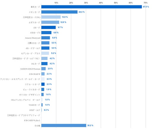 アンケートによれば、具体的なカードのブランドとしては、楽天カードが最も多く、次いでイオンカードや三井住友カード(NL)となった。