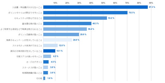 アンケートによれば、クレジットカードを選ぶポイントとして多く挙がったのは「入会費・年会費がかからないこと」で87.3%であった。次いで「ポイントやマイルが貯まりやすいこと」も70.5%と多く、その他にも「セキュリティが安心できること」、「基本還元率が高いこと」なども人気であった。