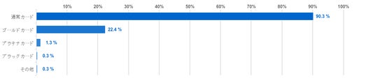 アンケートによれば、クレジットカード利用者の多くが通常カードを保有しており、その割合は90.3%である。これに対しゴールドカードを保有している回答者は22.4%と少なく、さらにプラチナカードおよびブラックカードの保有者はそれぞれ1.3%、0.3%と非常に少数である。