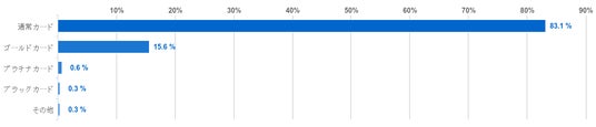 アンケートによれば、メインで使用しているクレジットカードのランクとして最も多いのは通常カードであり、その割合は83.1%である。これに対して、ゴールドカードをメインで使用している回答者は15.6%にとどまり、プラチナカードおよびブラックカードの利用者はさらに少数で、それぞれ0.6%、0.3%である。