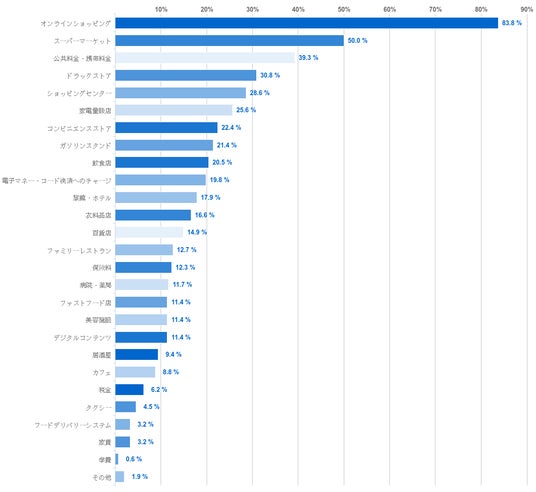 近年ではスーパーマーケットやコンビニエンスストアでの日常的な買い物、レストラン・飲食店でのクレジットカード払いも広く普及しているが、今回のアンケート結果にもキャッシュレス化の浸透が現れている。