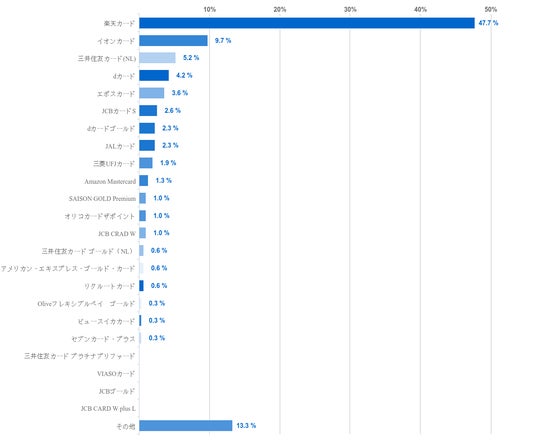アンケートによれば、メインで利用するクレジットカードとして最も選ばれているのは楽天カードであり、全体の47.7%を占めている。楽天カードの人気の理由としては、年会費無料やポイント還元率の高さが挙げられる。